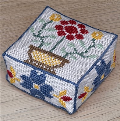 Inspired by the samplers owned by Ackworth School in Yorkshire, this simple counted cross stitch pincushion is formed into a boxed shape, and could also be used as a paperweight.