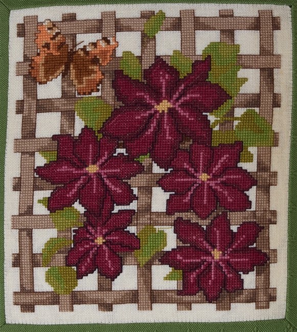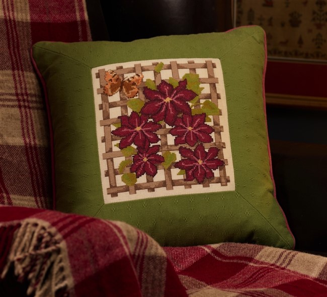 The strongly coloured clematis cushion panel was inspired by the flower in Jane Greenoff's garden in the Cotswolds. This panel is worked in counted cross stitch and backstitch on either 14-count Aida or 28-count Linen. There are no fractional stitches!