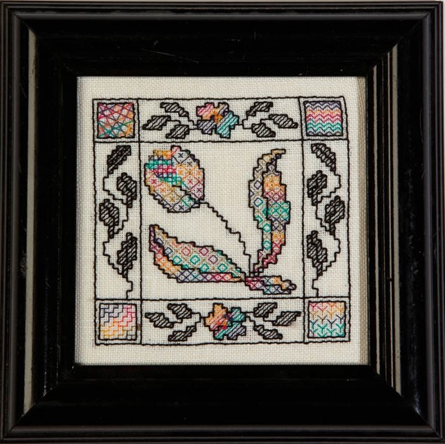 Blackwork is often used to depict flowers or stylized historical patterns and consists of geometric patterns built up using Holbein stitch (double running stitch) and was traditionally worked in black thread against a contrasting (usually white) background with gold metallic highlights added for extra impact.