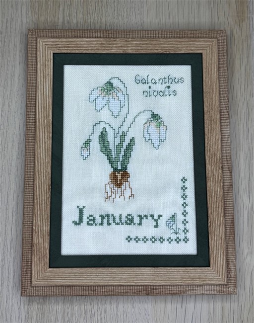 For January we have this beautiful botanic style Snowdrop. It is stitched using cross stitch, backstitch, French knots and seed bead pearls.