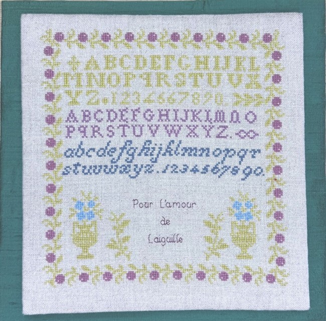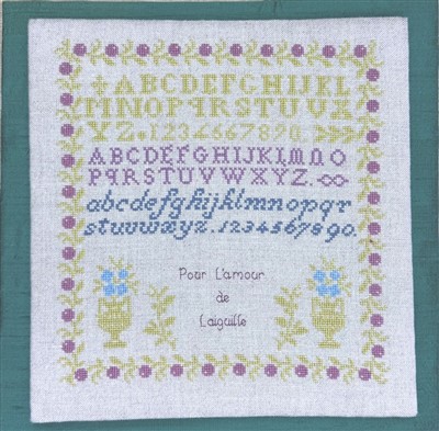The French saying translates as "For the love of the needle". But an Alphabet is supplied if you wish to personalise your sampler.