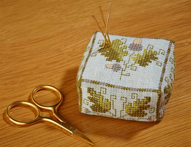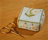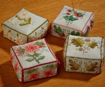 Designed to complement our mini Chatelaine and Watbo series, this sweet little pincushion is worked in cross stitch and backstitch and then made up by hand. My versions are filled with dry rice which makes them lovely to handle. If you click on the picture to the left you can see them in more detail